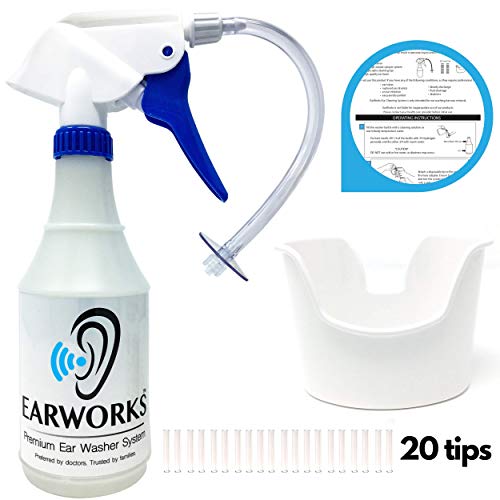 - 20 disposable tips and 1 easy resealable storage bag.~~✔️ONE OF THE BEST HIGH OUTPUT SPRAYER SYSTEM ON THE MARKET. Our trigger delivers three times more liquid than any other regular ear cleaning systems. Comfortable handle that delivers 3.0 ml per stroke. It ensures a more thorough irrigation procedure. Our ear cleaning system follows the American Academy of Otolaryngology Guidelines for ear irrigation.~~✔️EASY TO USE MANUAL WITH ILLUSTRATIONS. Best step by step instruction manual on the market WITH ILLUSTRATIONS for easy operation.~~✔️EASY TO STORE. Durable and resealable plastic storage bag with handle. Store in a safe